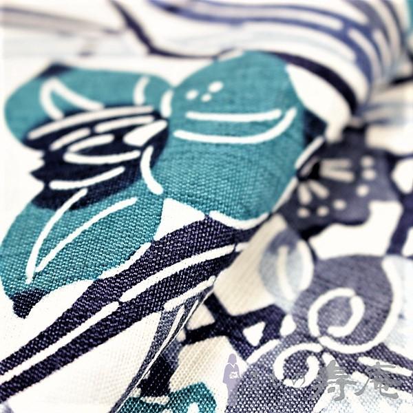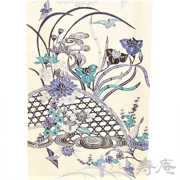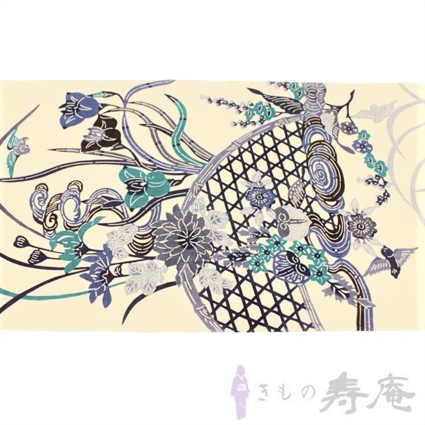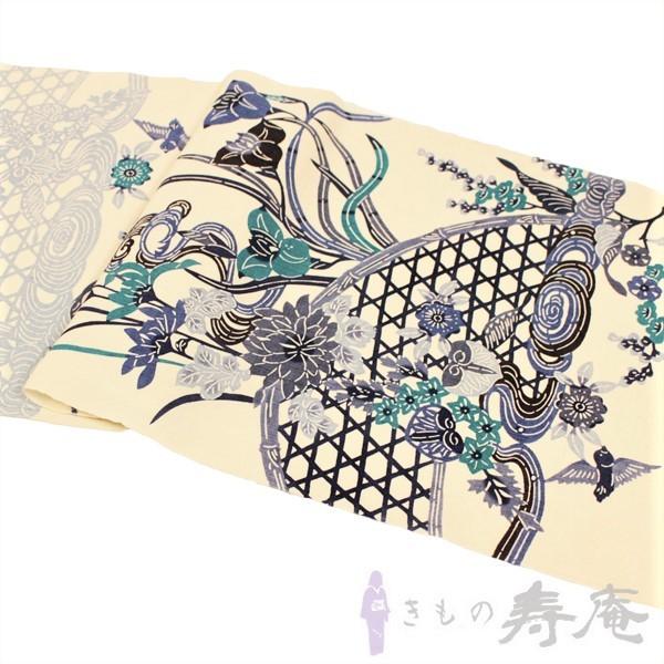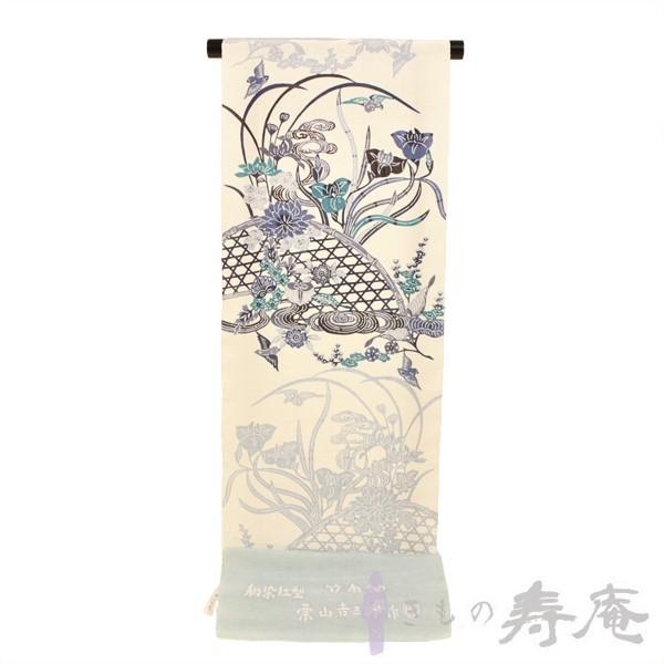 栗山吉三郎 九寸名古屋帯 和染紅型 竹糸紬 垣に千鳥 紺 水色 単衣 袷 女性用 未仕立 新品