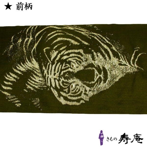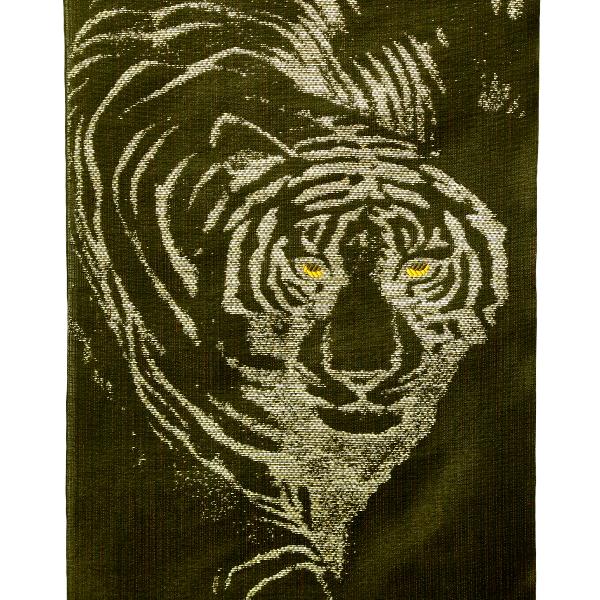 黒地に縦糸に細い赤糸をいれた粋でお洒落な地色に金と銀の引き箔で虎を描いた逸品です。
