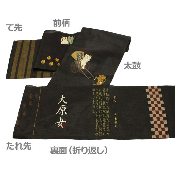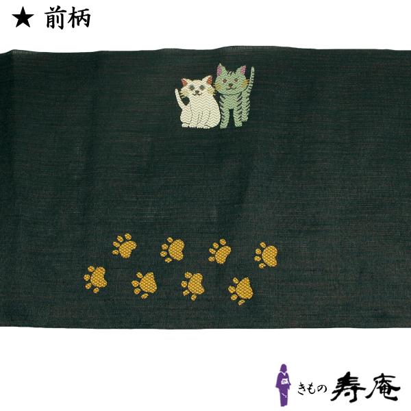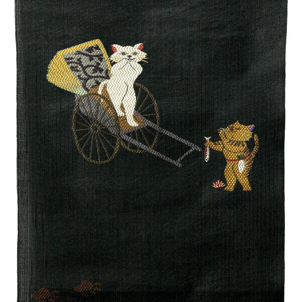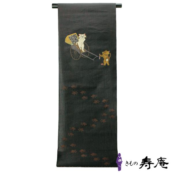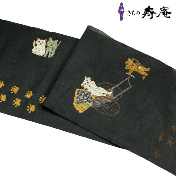 名古屋帯 黒地 猫のプロポーズ 仕立込 単衣 袷 九寸 西陣 鷹匠 赤糸のラメ 大原女染め カジュアル 新品 日本製
