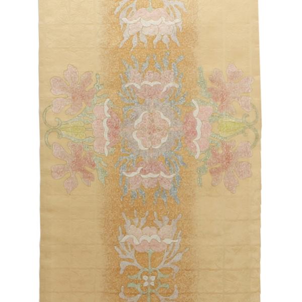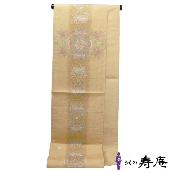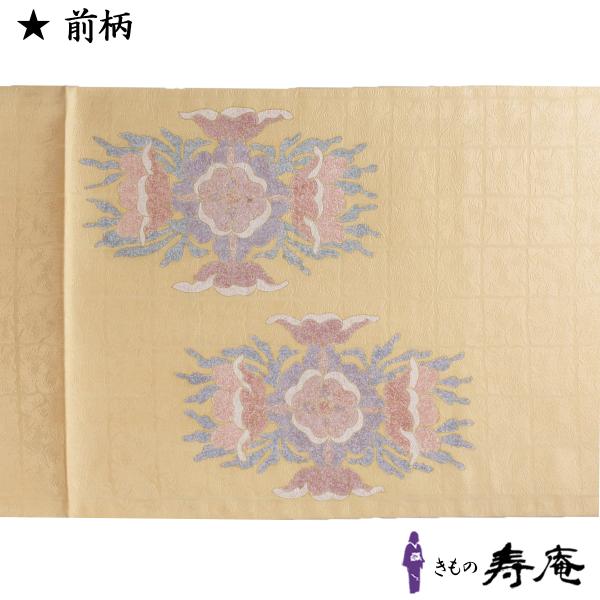 こちらの帯は西陣織の格子の地紋に、薄いオレンジ色を染め、