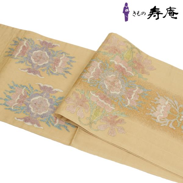 帯 袋帯 染帯 ロウケツ染 仕立込 締めやすい 軽い セミフォーマル カジュアル オレンジ 日本の絹 絵柄座 絹100% 礼装用 唐花模様 新品 未仕立 日本製