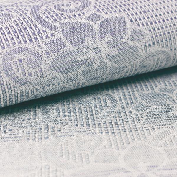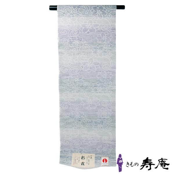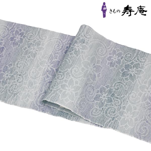 帯 仕立て込み 単衣 オールシーズン 捩り織 桐生織 八寸 名古屋帯 キビソ織 霞 紫 グレー 紋織 唐草 新品 未仕立て