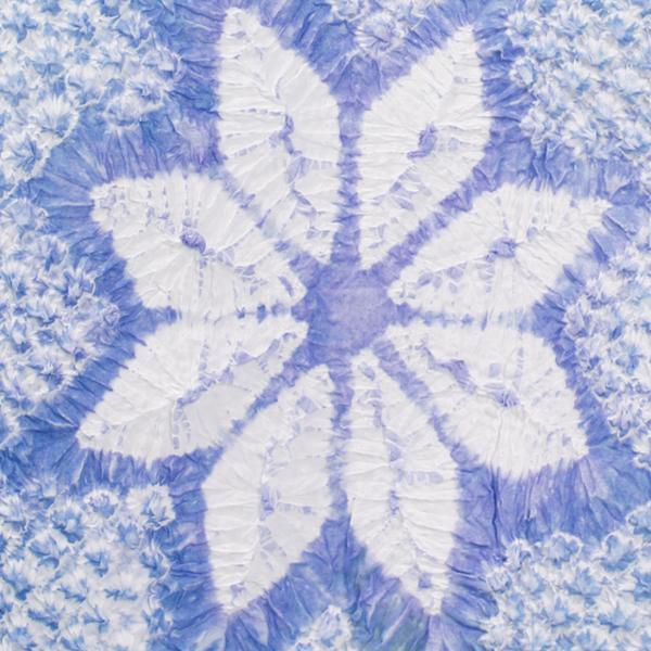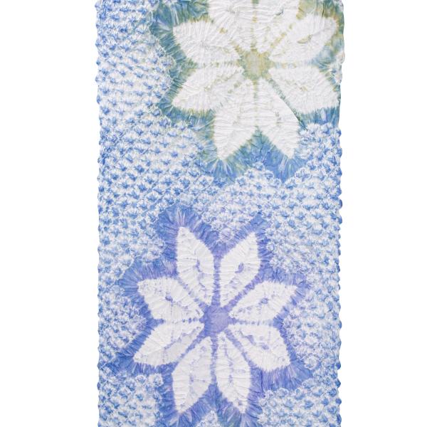 こちらの浴衣は鹿子絞りで、紫がかったブルーとイエローと青紫でぼかしと模様をつくっています。