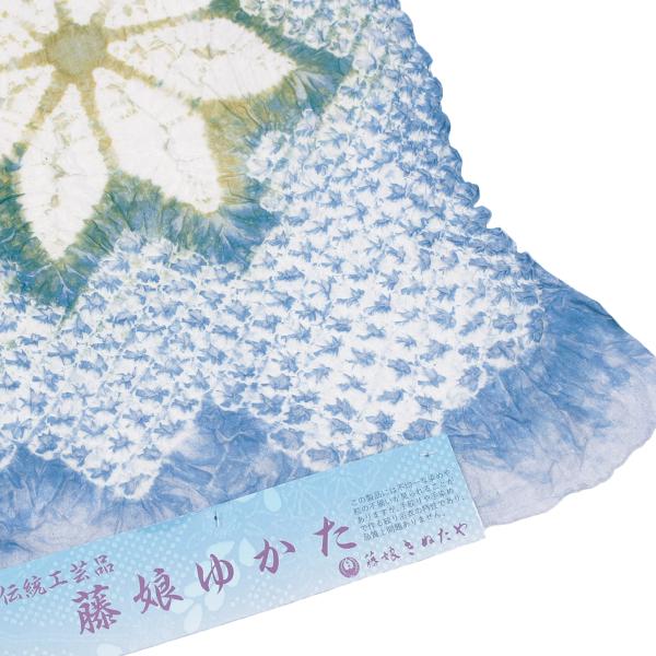 藤娘 きぬたや 浴衣 総絞り 有松鳴海絞り ブルー 白 グリーン イエロー 楓 ぼかし 蜘蛛絞り 花柄 高級浴衣 綿 新品 日本製 未仕立