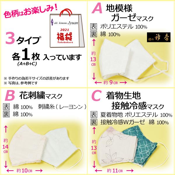 福袋 マスク 送料無料 衿秀 地模様ガーゼ 花刺繍 着物生地接触冷感 3タイプ 3枚 新品 日本製