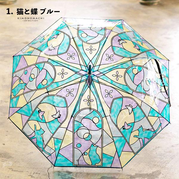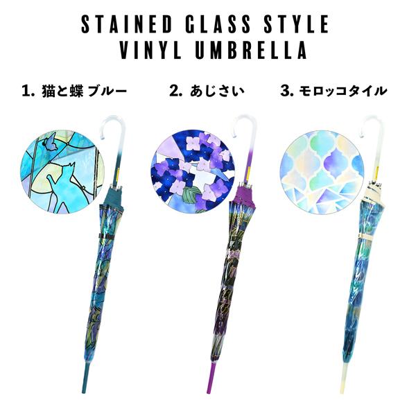 傘 長傘 ステンドグラス傘 単品「猫と蝶 ブルー・あじさい・モロッコタイル」雨傘 女性用 レディース women's プレゼント ギフト 母の日 誕生日(メール便不可)