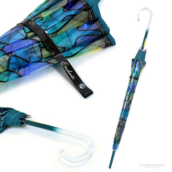 ハンドルは、ステンドグラスの雰囲気にピッタリのクリアハンドル。傘の裾分は、パイピング加工がされているので丈夫で長持ちです。ハンドルの色と同じ色の生地を使用しており、こだわりを感じさせます。