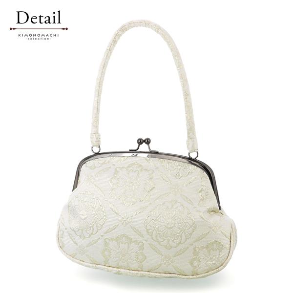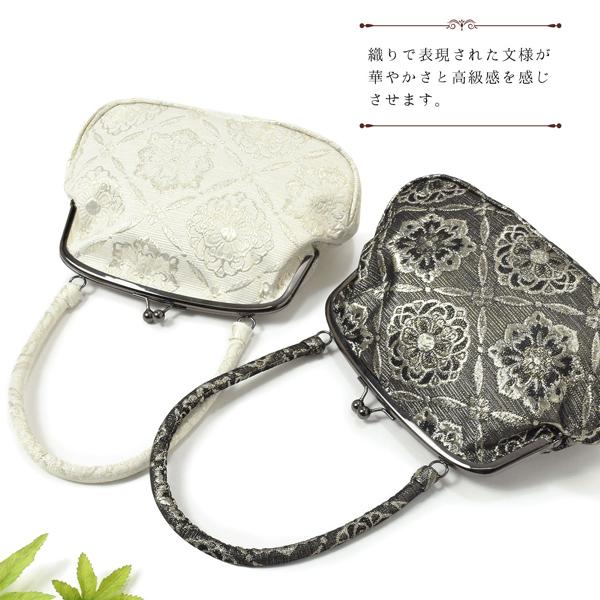 ジャガード織り がま口バッグ 単品「シルバーホワイト 菱格子に花」バッグ ジャガード生地 アンティーク調 カジュアル パーティー お洒落 (メール便不可)