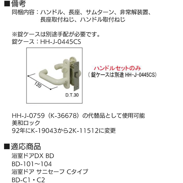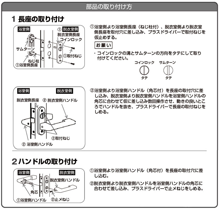 同梱内容:ハンドル、長座、サムターン、非常解装置、長座取付ねじ、ハンドル取付ねじ
