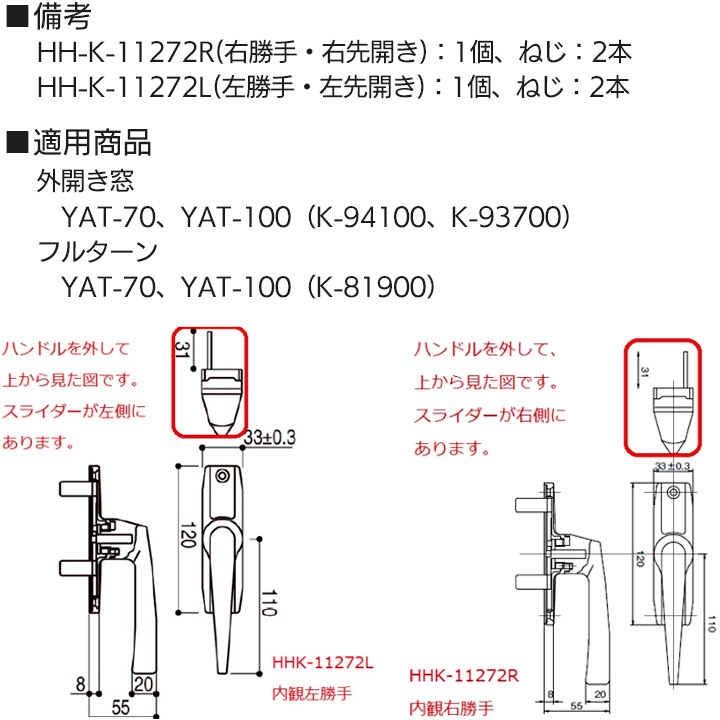 YKK AP HHK11272R HHK11272L 純正品 【交換要領書付き】 ハンドル YKK ワイケーケー サッシ 部品 HHW-HHK11272R YAT-100 外開き窓 HH-K-11272R HH-K-11272L