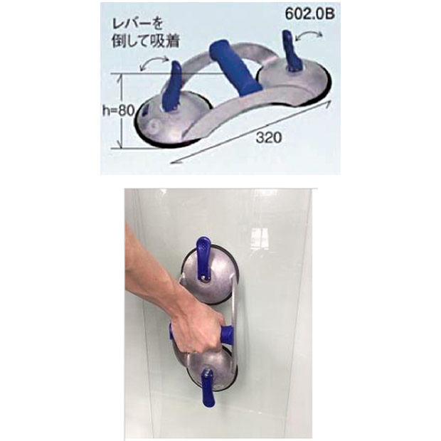 ■説明:2つのゴム面を、ぴったりガラス面に当るように押さえ、レバーをたおして吸着させます。