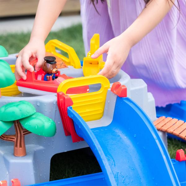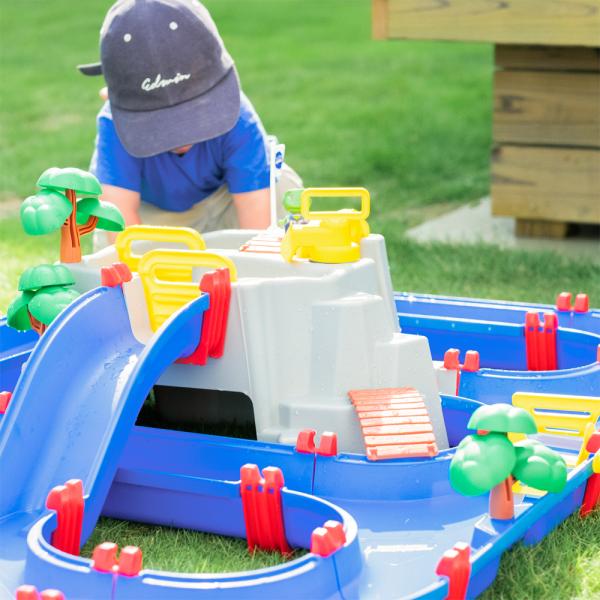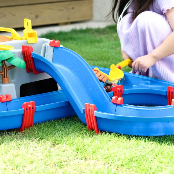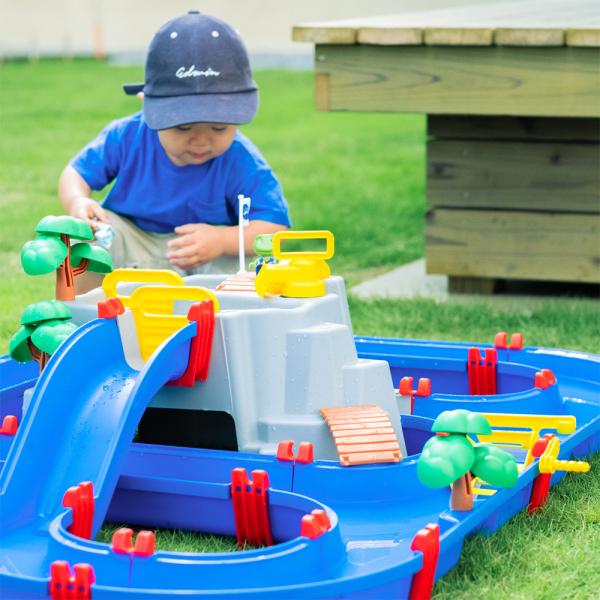 アクアプレイ マウンテンレイクは、高さのあるカナルロックシステムから、一気に坂道を流れ落ちるボートのスピーディーな動きを楽しめるセットです。