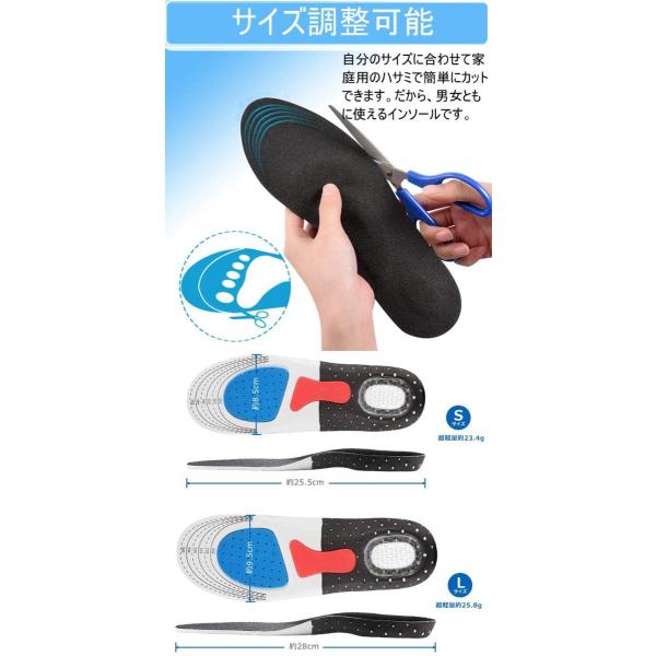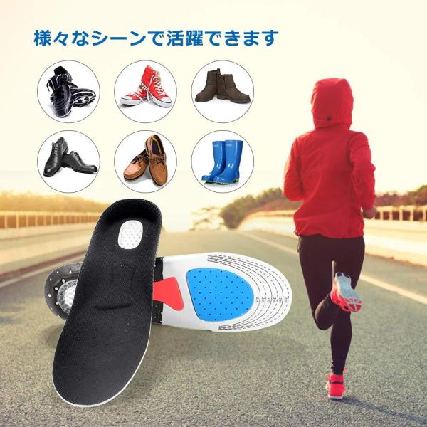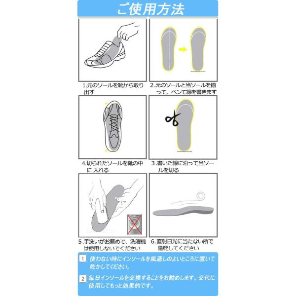 【大活躍】衝撃吸収型のソフトクッションを搭載しておりますので、こんな場合でお勧めします。1.スポーツ、運動する時 2.立ち仕事 3.大きめの靴のサイズ調整 4.底の薄い靴・硬い靴をご利用の方 5.足裏の痛み軽減・疲労緩和サポート 6. 足裏の痛み軽減・疲労緩和サポート 7. 傷んだ中敷きの交換用として