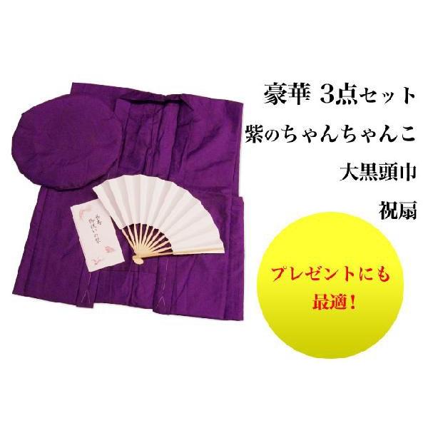 古希 祝い 古希 喜寿 傘寿 お祝い着に ちゃんちゃんこ 大黒頭巾 古希 祝扇 豪華 3点 セット 紫