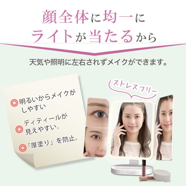 LED女優ミラー 鏡 卓上 三面鏡 拡大鏡 ライト付きミラー 充電式【スタイリングスタンドLEDメイクアップミラー】70灯 角度自由調整 belulu 正規品 1年保証付