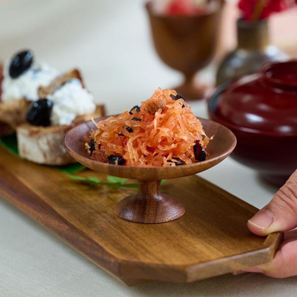 いつもの料理を少し丁寧に見せたい場面で活躍する、高台付きの木製豆皿。