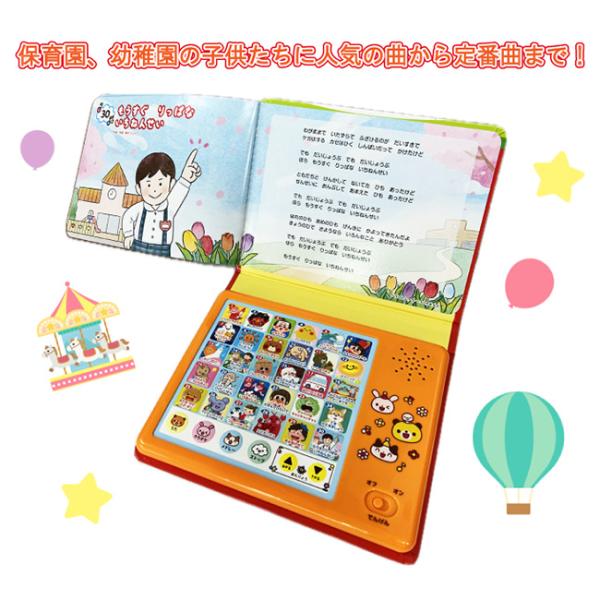 園で人気の歌をおうちでも楽しめる絵本。開くとイラストと歌詞が書かれている絵本と、ボタンで操作ができるパネルがあります。