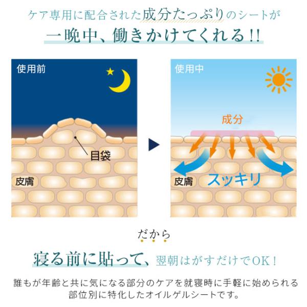 寝る前にジェルシートを目袋に貼り、翌朝はがすだけの簡単スキンケア。目の下の目袋に合わせた形状になっています。