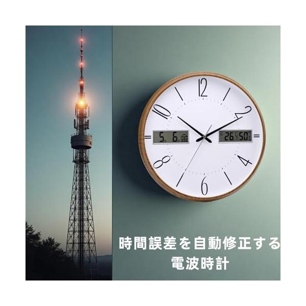 掛け時計 電波時計 直径38cm 静音設計 連続秒針 日付・曜日表示 温度/湿度 表示 淡い茶色の枠