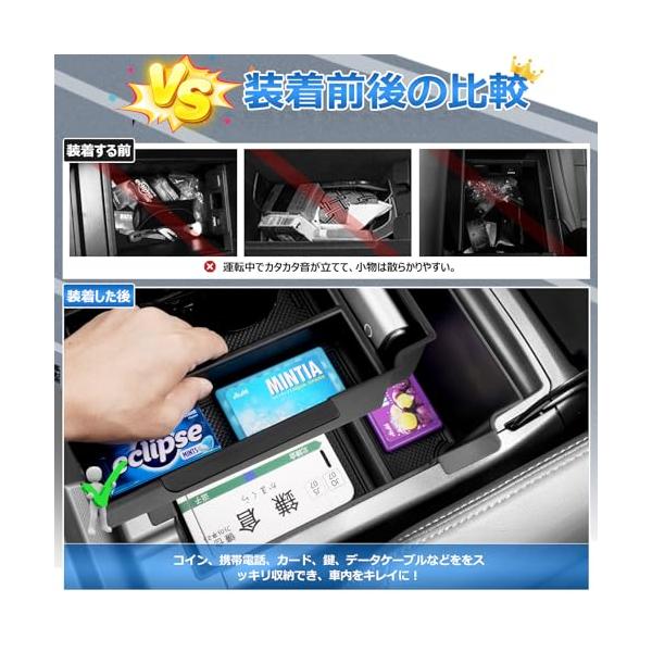 ・3.3段構造化:2つ収納トレイを追加で三段収納エリアに分割されています。コイン、携帯電話、カード、鍵、データケーブルなどををスッキリ収納でき、車内をキレイに!運転席周りのスペースにきれいになります、気分良くドライブを楽しめます。