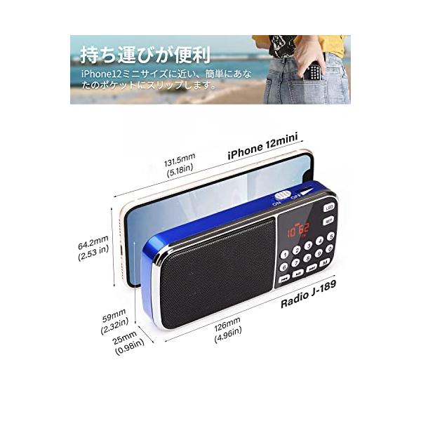 ・?ポケットラジオ:この充電式ポータブルラジオ(サイズ:126*59*25mm;重量:126g)は、iPhone 12miniのサイズに近いため、ポケットに合うほど小さいです。隠されたアンテナとして動作するストラップも装備されており、持ち歩くのは非常に簡単です。朝のエクササイズ、散歩、公園での休憩などは素晴らしいラジオ放送と一緒にお楽しみできます。