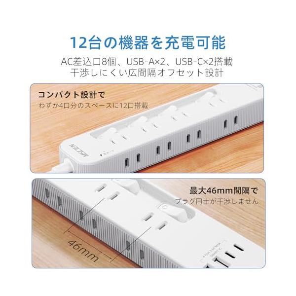 ・12台機器同時充電8つのAC差込口に加え、コンセント USB(USB-A) と コンセント タイプc(USB-C) をそれぞれ2ポートずつ搭載し、最大12台のデバイスを同時に充電できます。延長コード 2m の使いやすい長さで、AC差込口で家電に給電しながらUSBポートで小型機器も同時充電。リビング、休憩スペース、ゲームコーナー、寝室、キッチンなど、さまざまな場所での電源供給に最適です。