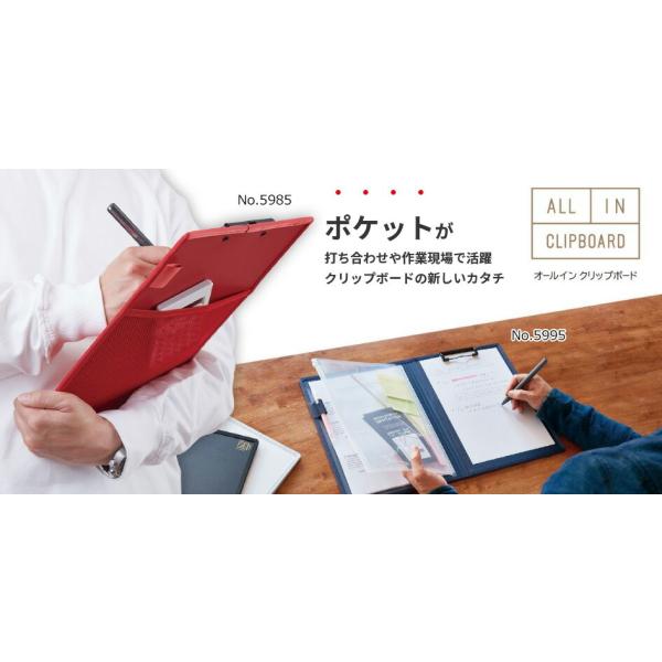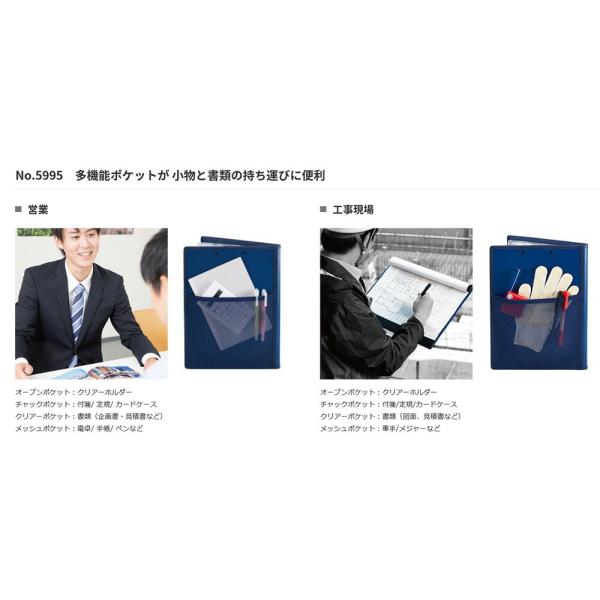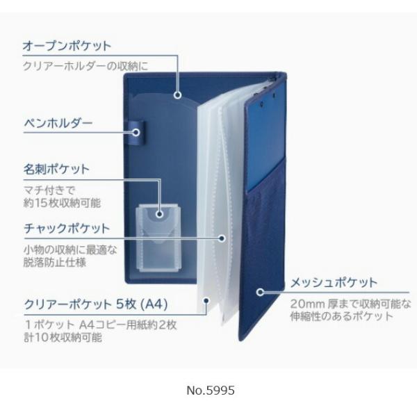 様々な用途のポケット<br>多機能ポケットが 小物と書類の持ち運びに便利<br><br>【商品説明】<br>○オープンポケット<br>・クリアーフォルダーの収納に<br>○ペンフォルダー<br>○名刺ポケット<br>・マチ付きで約15枚収納可能<br>○チャックポケット<br>・小物の収納に最適な脱落防止仕様<br>○クリアーポケット5枚(A4)<br>・1ポケットA4コピー用紙約2枚、計10枚収納可能<br>○メッシュポケット<br>・20mm厚みまで収納可能な伸縮性あるポケット<br><br>医療・イベント・展示会・営業・工事現場などの場面で活用<br><br>【詳細】<br>・品番:No.5995<br>・外寸:約 251(W)× 333(H)×(D)23mm<br>・質量:358g<br>・クリップ最大収納枚数:コピー用紙約30枚<br>・材質:3種3層発泡PP(表紙)<br>・ナイロン(メッシュ・パイピング)<br>・仕様:内側オープンポケット・名刺ポケット・ペンホルダー・チャックポケット・クリアーポケット5枚付き、背面メッシュポケット付き