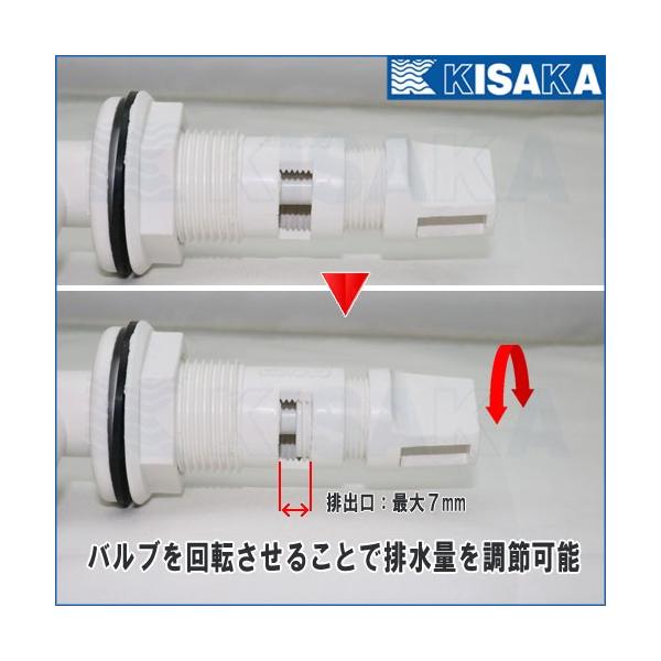 先端がシャットオフ(開閉)バルブになっており、回転することで排水量を調節することができるので、オーバーフローシステムのライブウェルに有効なアイテムです。
