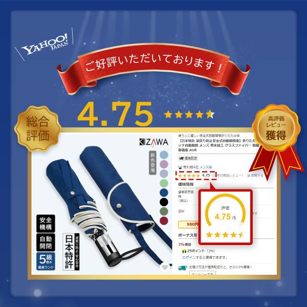 自動開閉、逆戻り防止機能付き、日本特許取得セーフティシャフト搭載、逆さ傘、耐風骨、撥水、軽量、頑丈な骨組み、大きいサイズ、男女兼用