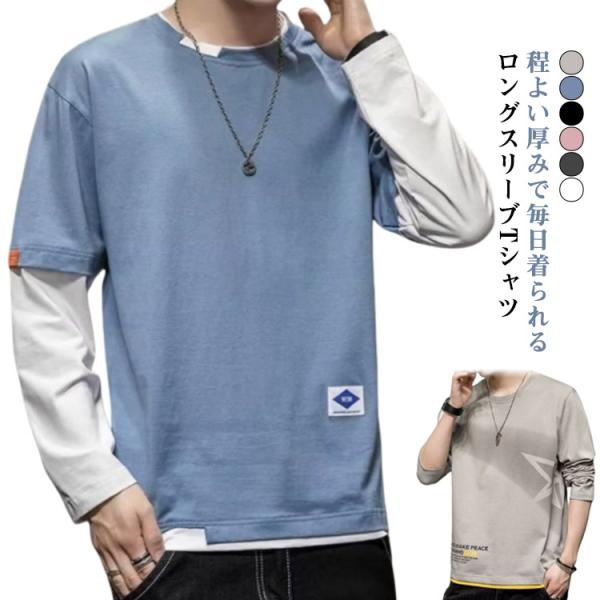 メンズ 秋服 長袖tシャツ Tシャツ 長袖 メンズ ロングTシャツ 重ね着風 ロンT レイヤード風 Tシャツ ロングTシャツ シンプルTシャツ 韓国