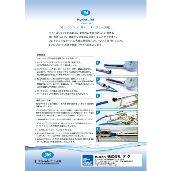 ハイドロジェットは強い水流により楽器を効果的に洗浄することができます。フレキシブルなホースの先端に特別なスプレーノズルがついており、6つのジェット水流で楽器内の汚れを落とします。ハイドロジェットがあれば楽器内の手の届きにくい箇所も簡単にクリーニングできます。