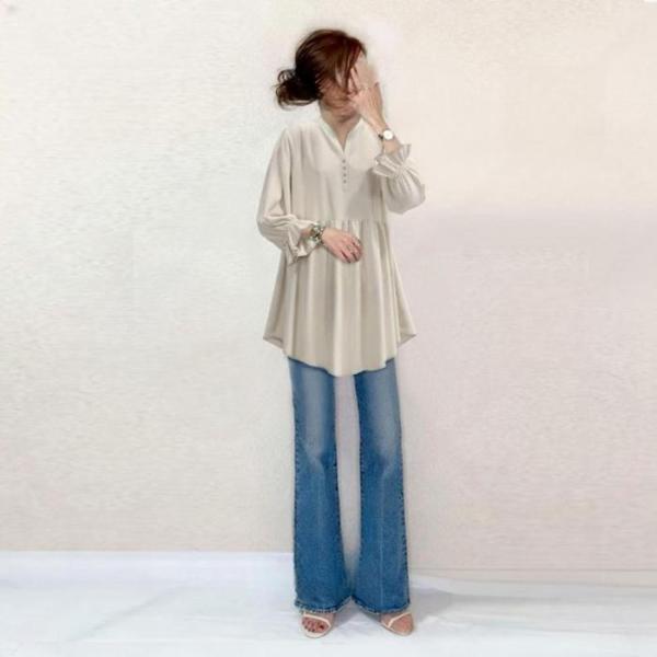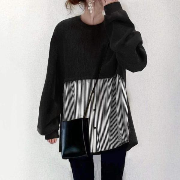 ブラウス レディース 長袖 フリルブラウス Vネック クルーネック 切り替え ストライプ カジュアル 体型カバー ゆったり 20代 30代 40代 通勤 通学 お出かけ 春 秋 冬