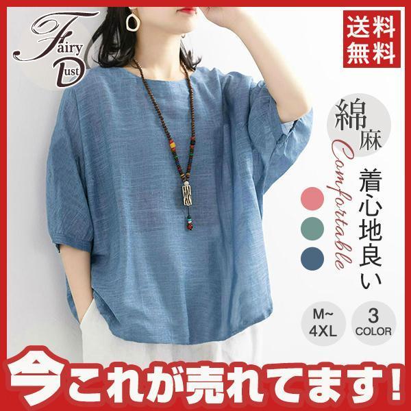 リネンシャツ 綿麻ブラウス 夏新作 レディース 薄型 綿麻 半袖Tシャツ ス 無地 体型カバー ゆったり 大きいサイズ ボリューム袖