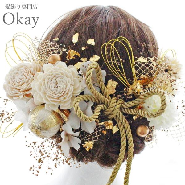 髪飾り 卒業式 袴 成人式 振袖 水引 金箔 和玉 白 ゴールド 高級 造花 680