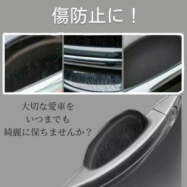 ドアハンドルプロテクター4枚セット。爪傷や引っかき傷を防止し、車のドアノブを保護。防水仕様で雨や水滴にも強く、静電気防止機能付き。カーボン調デザインで高級感あり、愛車のドレスアップにも最適。サイズ横約9cm×高さ約10cmで、多車種対応可能。ハサミでカット可能なので、形状に合わせて調整可能。シールタイプで簡単装着、便利なカー用品。