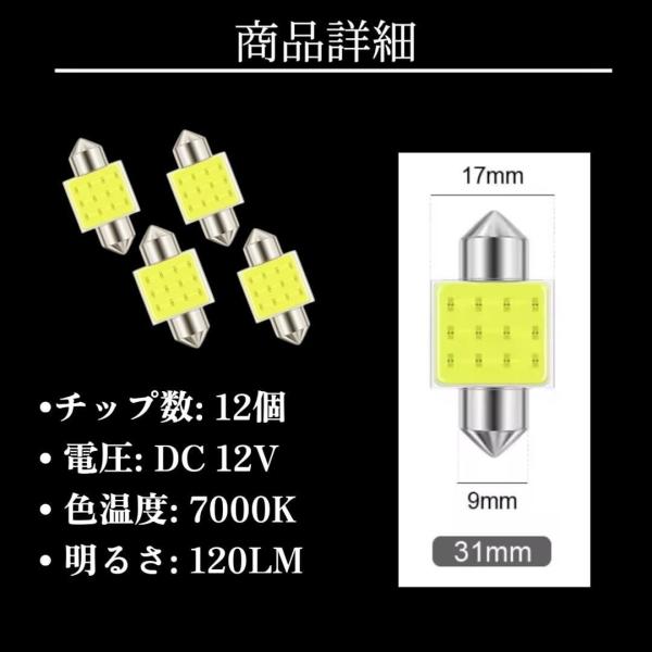 ルームランプ T10 LED 31mm COBチップ 爆光 車内灯 ナンバー灯 ドアライト 4個セット ホワイト 白 車載用 カスタム パーツ