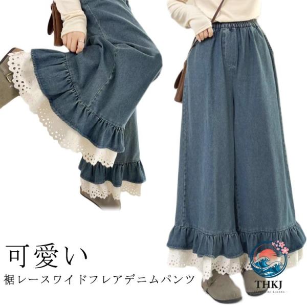 切り替え ワイド レディース ロング丈 パンツ コーデ 裾 夏 デニム 異素材 レース フリル ガウチョパンツ デニムパンツ スカーチョ ロングパンツ イージーパンツ