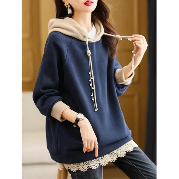 フード付き 裏起毛 プルオーバー レディース 重ね着風 ゆったり スウェットパーカー 可愛い トレーナー フード付き パーカー カジュアル 大人 カジュアル レース