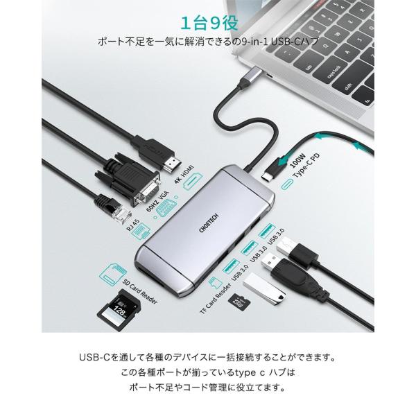 CHOETECH HUB-M15 USB C ハブ 9in1 超軽量 Type c LAN RJ45 / 3ポート5Gbps usb3.0 / 4K / VGA / 100W PD /TF /SDカード