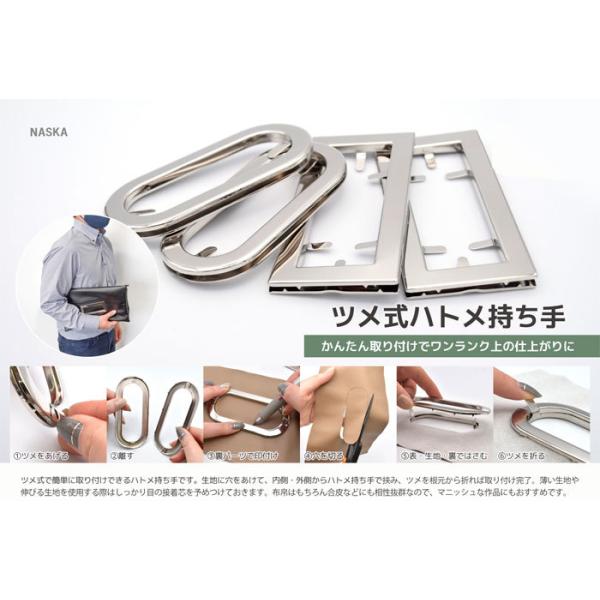ツメ式で簡単に取り付けできるハトメ持ち手です。生地に穴をあけて、内側・外側からハトメ持ち手で挟み、ツメを根本から折れば取り付け完了。薄い生地や伸びる生地を使用する際はしっかり目の接着芯を予めつけておきます。布帛はもちろん合皮などにも相性抜群なので、マニッシュな作品にもおすすめです。