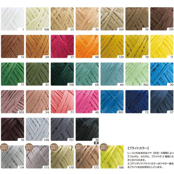 バッグ・帽子・インテリアまで幅広く使える春夏手芸の代表格。豊富な色数、サラサラの手ざわり、針のすべりが良いレーヨン100%手芸糸。アンダリヤは木材パルプを原料とする再生繊維で、土に戻る地球にやさしい素材です。