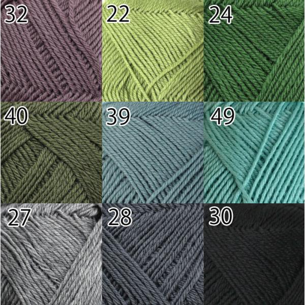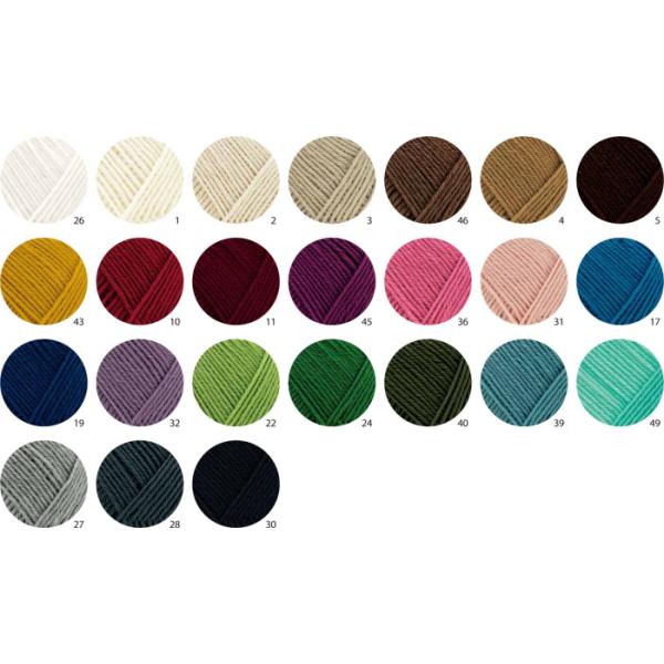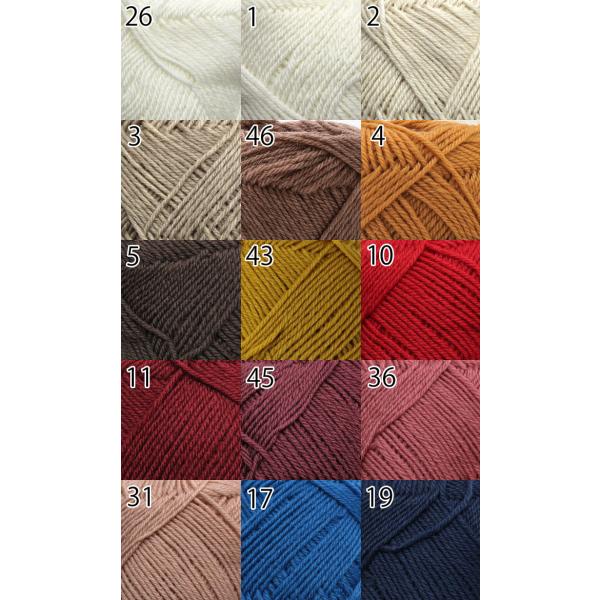 人気のかぎ針編み作品や機械編み作品に適したポピュラーな純毛中細タイプ。多色使いのモチーフ作品にも。