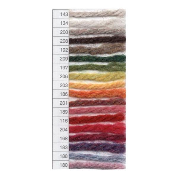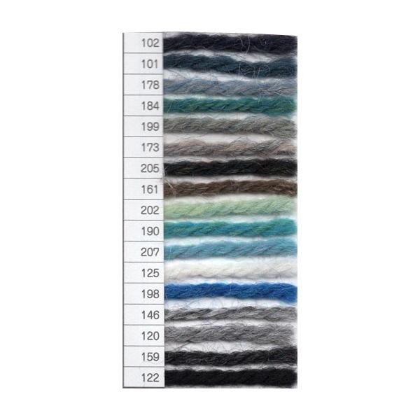 スポンジ性と張りが特徴の英国羊毛に、しなやかさ・柔らかさのある多品種の羊毛をブレンド。編み物しやすい程よい硬さは初心者からベテランまで幅広い層に好まれています。紡績前の綿を染色する「トップ染め」により、多色が細かく混じり合うメランジカラーが色の奥行を出しています。