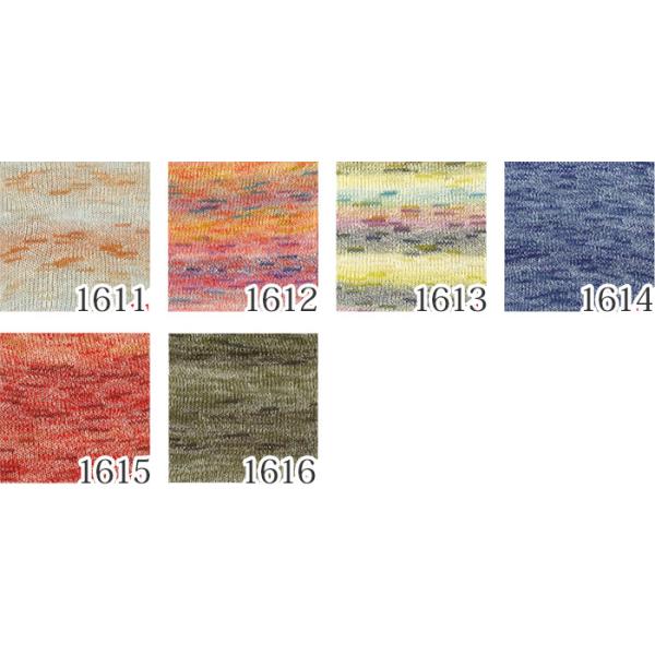 毛混の単色糸に5色のロングピッチ段染糸をダブルカバーした意匠糸です。多色使いの映えるカラーから、同色グラデーションを意識したカラーでのバリエーションです。かぎ針編みと棒針編みとでの、編み地の表情の違いを楽しんでください。