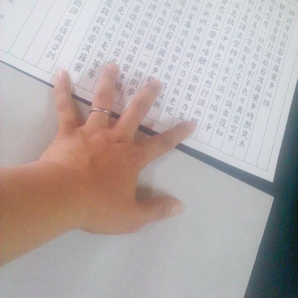 見本となる般若心経は文字を大き目に改良。(2022年3月時点)通常の文字の大きさは約1x1cmでしたが1.2x1.2cmへと20%大きく、年配の方や視力の悪い方にも見やすく書きやすい文字です。また、レイアウトを工夫する事により、紙の大きさは据え置いており、コンパクトなサイズをそのままにしています。なので、不必要に上半身を動かしたり、紙を手繰り寄せたり遠ざけたりといったストレスもなく、楽しく写経をしていただく事が可能となっております。