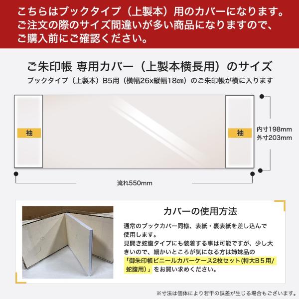 ※ご注文の際のサイズ間違いが多いです、ブックタイプ(上製本)用のカバーになります。見開き蛇腹タイプにも装着する事は可能ですが、ちょっと大きいです。細かいところが気になる方は止めておいた方が無難です。蛇腹タイプのカバーをお探しの方は、姉妹品の「御朱印帳ビニールカバーケース2枚セット(特大B5用/蛇腹用)」をお買い求めください。