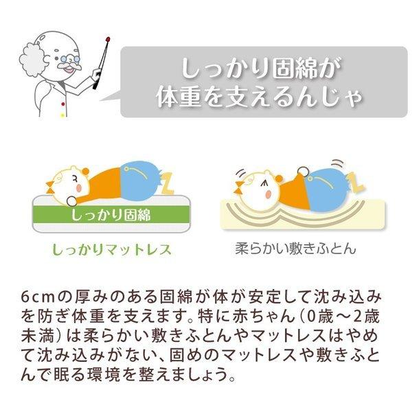 6cm厚のポリエステル固綿がしっかりと赤ちゃんを支え、沈み込みや窒息を防ぎます。ヘタリにくいので保育園のお昼寝ふとんとしてもお使いいただけます。ベビーベッドのサイズにあえばマットレス代わりにもなるベビーマットレスです。新生児から使用可能です。