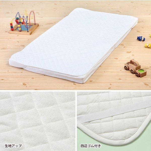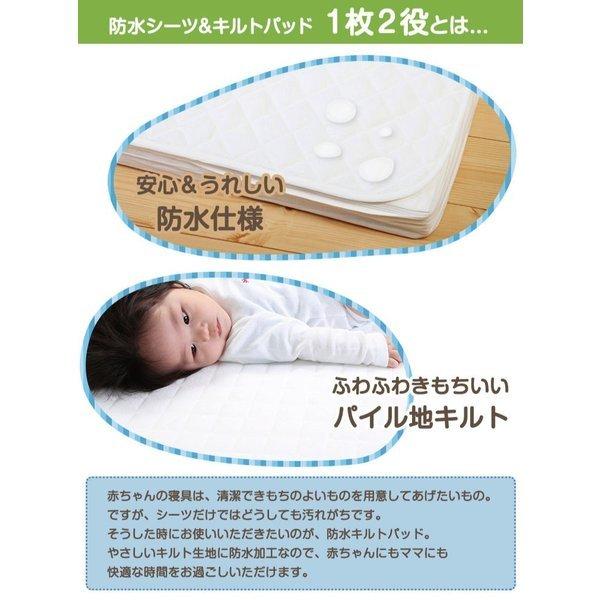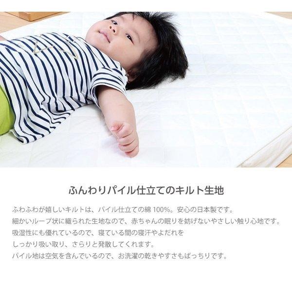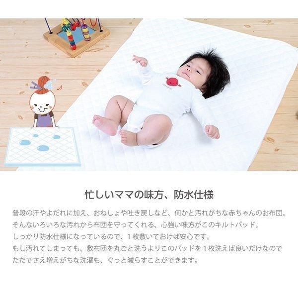 防水仕様のキルトパッドです。おねしょやよだれなどをしっかり防いでくれるので、下のお布団が汚れません。パイル仕立てで肌触りも赤ちゃんにやさしい風合いです。洗濯機で丸洗いができます。