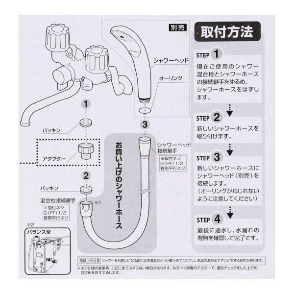 ◇◇ 【特長】 ●現在ご使用中のシャワーホースをはずし手軽に交換できます。 ●シャワーヘッド取付樹脂継手は回転式のため、ホースがねじれません。 ●ほとんどのメーカー取付可能!! ●シャワーホース取付ネジは管用平行ネジG1/2(呼び13)「約21mm、山14」です 【仕様】 ●材質:シャワーホース/塩化ビニル樹脂 回転ホース樹脂継手/ABS樹脂、ポリアセタール樹脂、黄銅 ホース樹脂継手/ABS樹脂、ポリアセタール樹脂、黄銅 シャワーアダプター/ポリアセタール樹脂 ●最高使用温度:約60℃ ●仕様水圧(約):0.05MPa(0.5kgf/cm2)〜0.75MPa(7.6kgf/cm2) ●ホース:内径11.0mm ●継手ネジ部規格:G1/2(外径20.955mm、山14) 【使用上のご注意】 ●ホースを無理に曲げたりすると、ホースが破損する恐れがあります。 ホースが破損して漏水し高温の湯が出て火傷したり、漏水し家財などをぬらす財産損害発生の危険があります。 ●シャワー掛具に適合するかどうかご確認ください