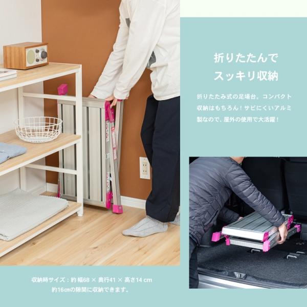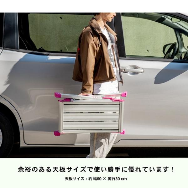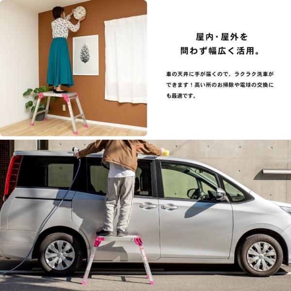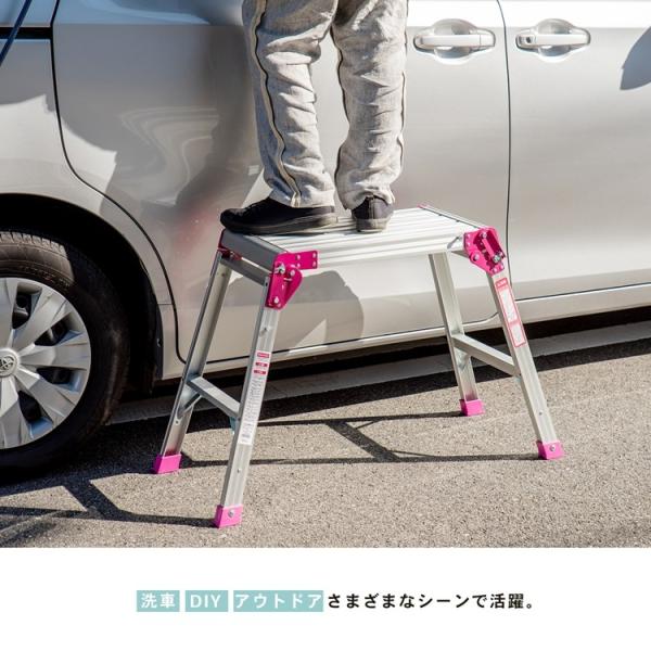 o作業用品 o踏み台・脚立 o洗車台 o新生活・踏み台・脚立 ◇◇ 【特長】 ●洗車に、DIYに、キャンプに、アウトドア必需品の折りたたみ足場台! ●屋内・屋外を問わず、幅広く使用できます。 【仕様】 ●サイズ:(約)幅60×奥行き30×高さ60cm ●収納時サイズ:(約)幅68×奥行41×高さ10cm ●使用時サイズ:(約)幅95×奥行き30×高さ60cm ●本体重量:(約)4.0kg ●耐荷重:(約)100kg ●材質 本体:アルミニウム合金(アルマイト処理・ラッカー仕上げ) 脚キャップ:塩化ビニル樹脂 ●カラー 本体:シルバー 連結部分、脚キャップ:ピンク ※色は多少異なる場合がございます。